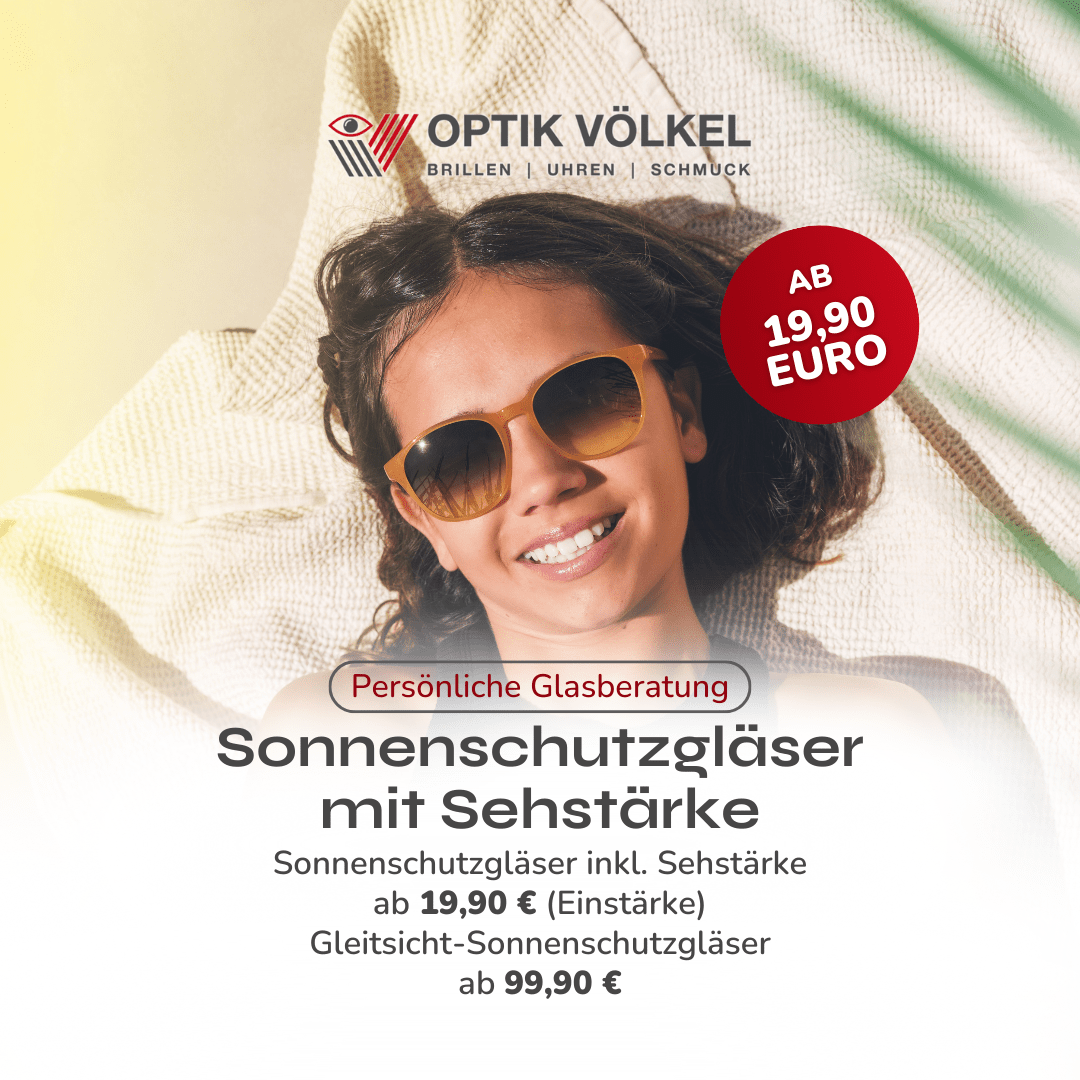 Zum Beginn der sonnigen Jahreszeit gibt es hochwertige Sonnenschutzgläser aktuell zu attraktiven Einstiegspreisen. Einstärken-Sonnenschutzgläser sind bereits ab 19,90 € erhältlich, Gleitsicht-Sonnenschutzgläser ab 99,90 €. Kunden können aus einer großen Auswahl an Farben, Tönungen und Glasvarianten die passende Lösung für ihre persönliche Sonnenbrille wählen. Eine individuelle Beratung beim Optiker hilft dabei, die optimalen Sonnenschutzgläser für Alltag, Beruf und Freizeit zu finden. Wer jetzt investiert, startet bestens vorbereitet in Frühling und Sommer und sorgt für langfristigen Schutz und hohen Sehkomfort.